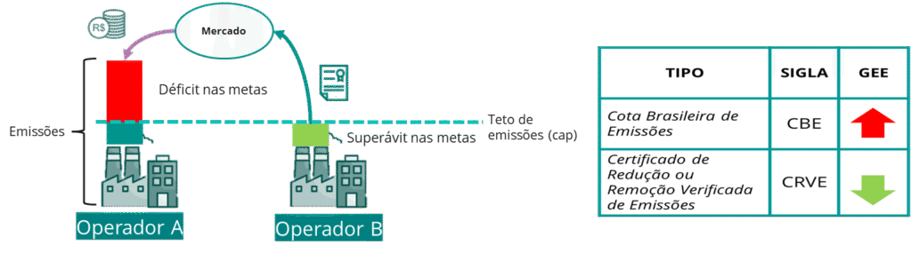 Adotou-se um modelo de cap and trade (metas e transações) para os setores regulados, ou seja, serão estabelecidas tetos de emissão por meio de Plano de Alocação, sendo admitidas trocas de ativos entre os agentes regulados para atingir essas metas.